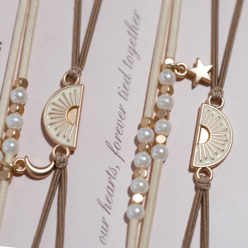 Celebrate the special connection between you and your best friend with our new Forever Friend Hair Tie Bracelet Set. Each set includes four adjustable-size bracelets, with two for each friend. Featuring a half-sunrise design, these bracelets come together to form a full sunrise, with dainty star and moon charms, symbolizing the light and positivity you bring into each other's lives. Our Forever Friend Set is crafted in neutral colors to complement any style. Whether worn as a bracelet or a hair tie, these are the perfect gift to show your love to a forever friend.